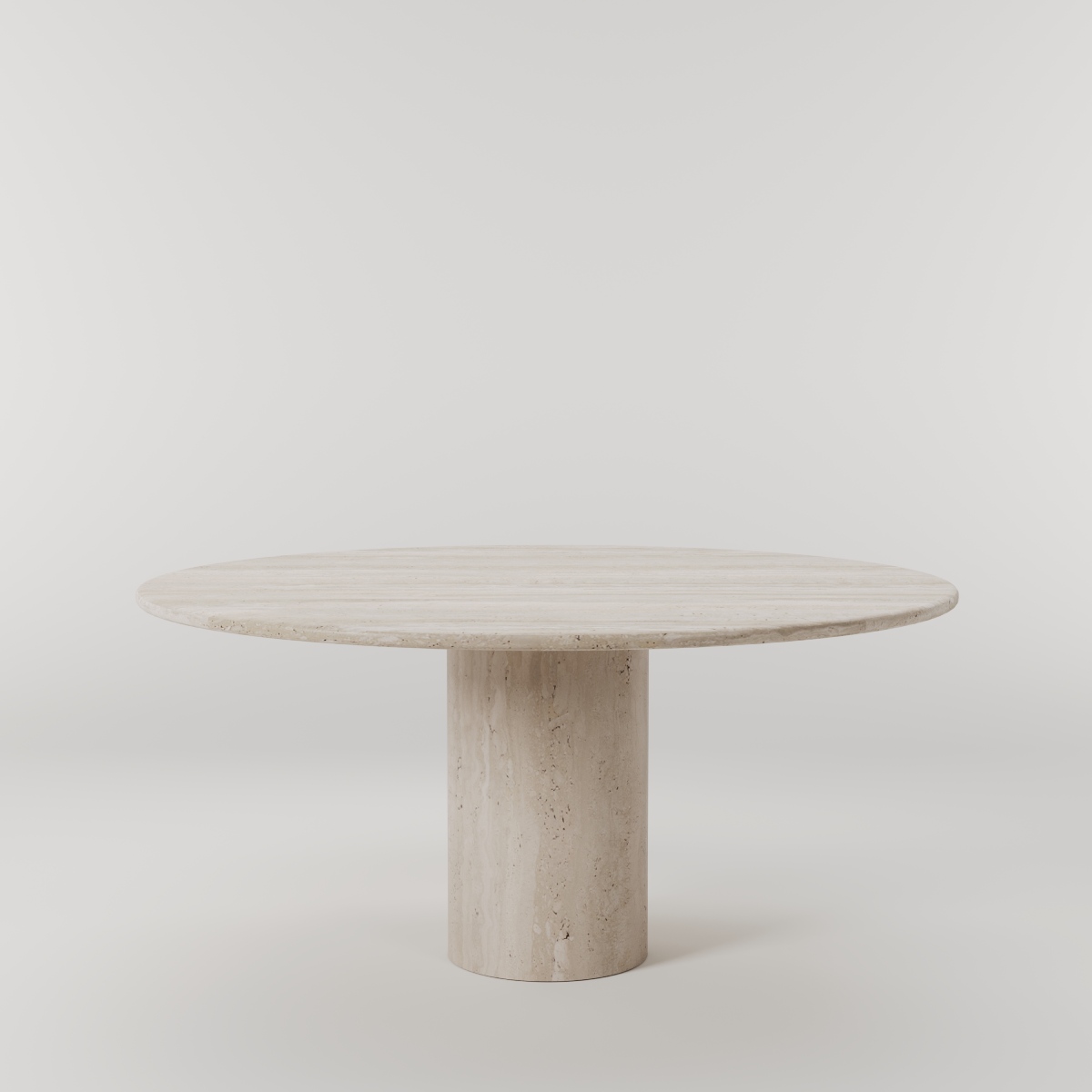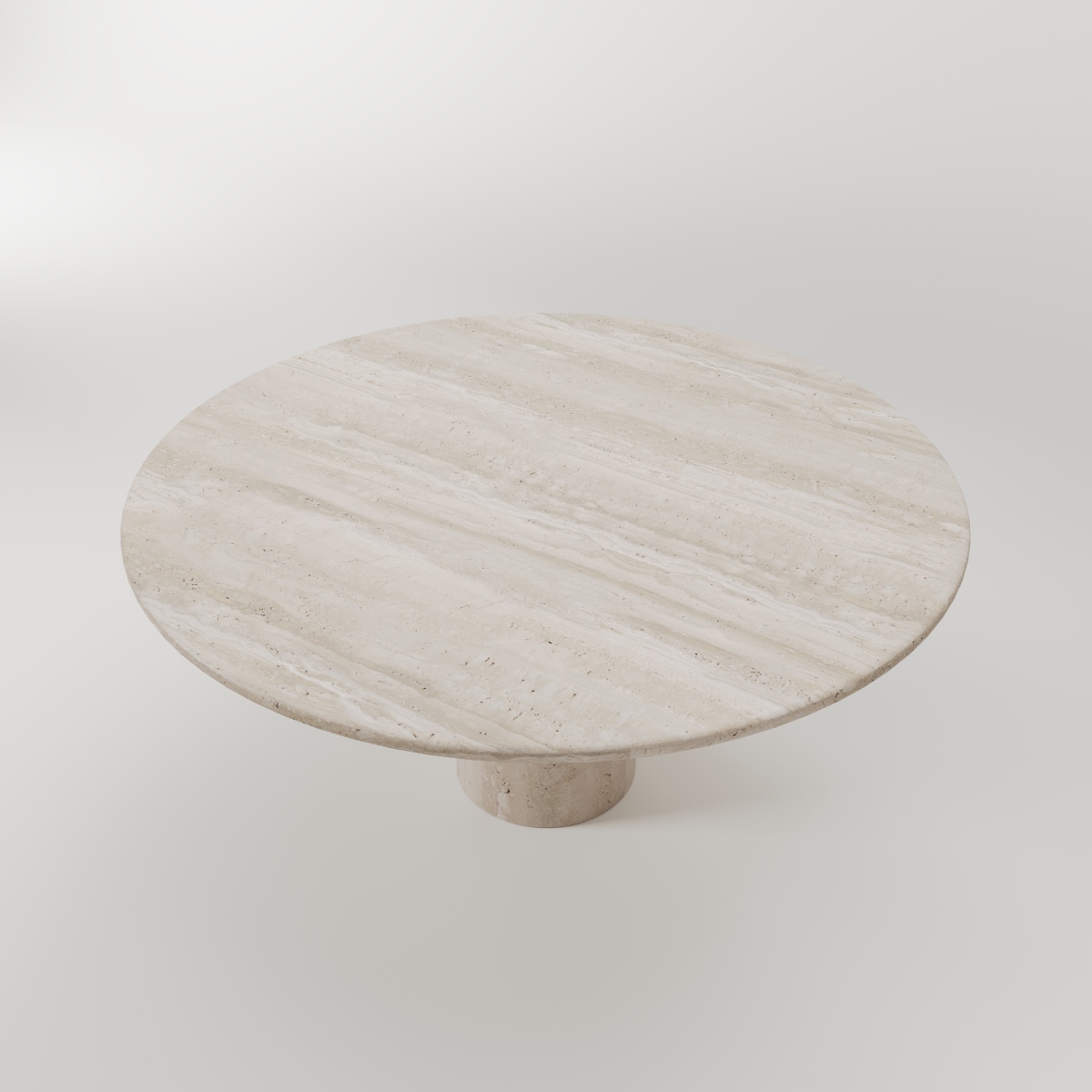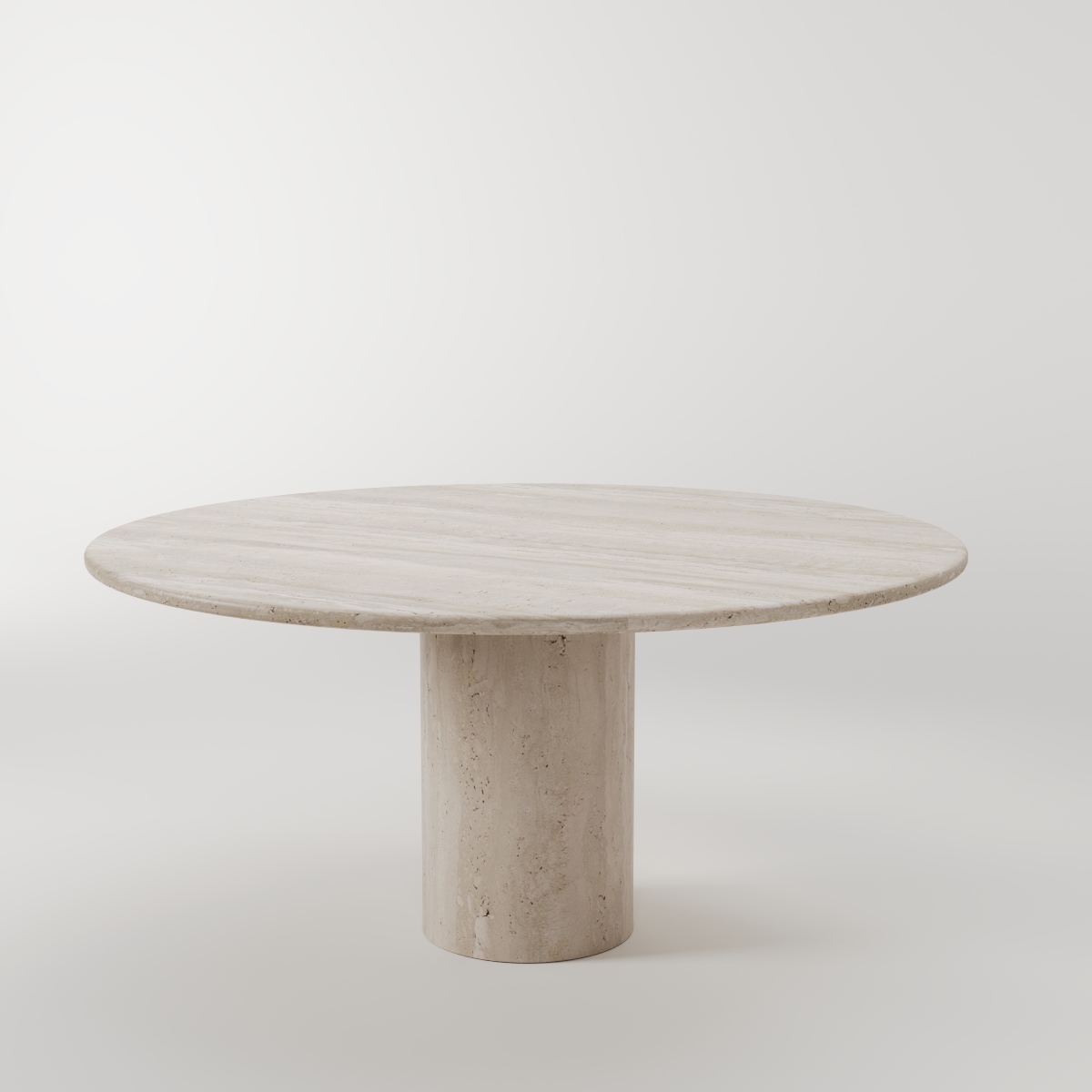 Maak kennis met onze Ronde Travertin Eettafel met Cilinderpoot: een iconisch designstatement dat tijdloos is. Het elegante ronde blad rust op een massieve cilinderpoot en straalt tijdloze luxe uit.